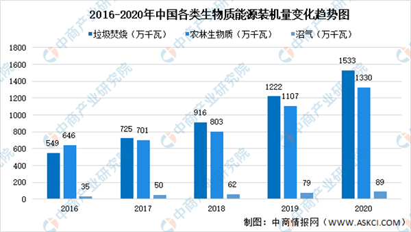 依據(jù)來源的不同,可以將適合于能源利用的生物質(zhì)分為林業(yè)資源、農(nóng)業(yè)資源、生活污水和工業(yè)有機廢水、城市固體廢物和畜禽糞便等五大類。其中,用來發(fā)電資源主要為垃圾焚燒、農(nóng)林生物質(zhì)及沼氣。數(shù)據(jù)顯示,2020年垃圾焚燒發(fā)電累計裝機達到1533萬千瓦;農(nóng)林生物質(zhì)發(fā)電2020年累計裝機達到1330萬千瓦;沼氣發(fā)電方面2020年累計裝機達到89萬千瓦。