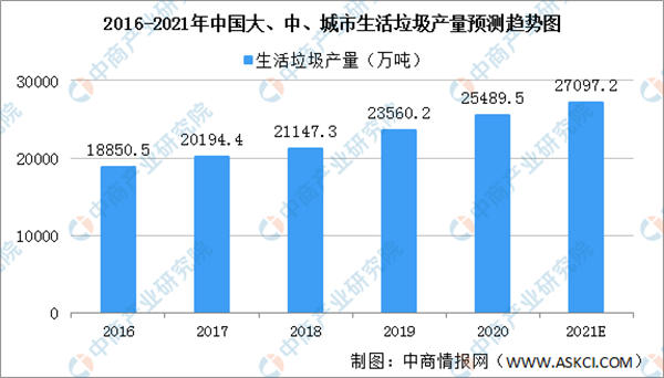 我國是人口大國,也是垃圾產(chǎn)生大國,且隨著經(jīng)濟穩(wěn)步發(fā)展、民眾生活消費水平、城鎮(zhèn)化率不斷提高,生活垃圾產(chǎn)生量持續(xù)增加。2016年我國大、中城市生活垃圾產(chǎn)生量18850.5萬噸,2019年生活垃圾產(chǎn)生量增至23560.2萬噸,預計2021年我國生活垃圾產(chǎn)量27097.2萬噸。