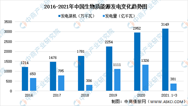 數(shù)據(jù)顯示,2020年,全國生物質(zhì)發(fā)電新增裝機543萬千瓦,累計裝機達到2952萬千瓦,同比增長22.6%;2020年生物質(zhì)發(fā)電量1326億千瓦時,同比增長19.4%;2021年第一季度,生物質(zhì)發(fā)電裝機3148.5萬千瓦,生物質(zhì)發(fā)電380.8億千瓦時。