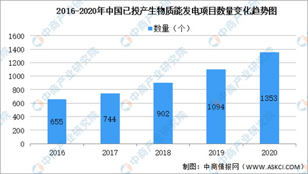 隨著我國對生物質(zhì)能發(fā)電越來越重視,我國生物質(zhì)發(fā)電相關(guān)項目量也在不斷增多。數(shù)據(jù)顯示,我國已投產(chǎn)生物質(zhì)能發(fā)電項目由2016年655個增至2020年1353個,年均復合增長率為19.9%。