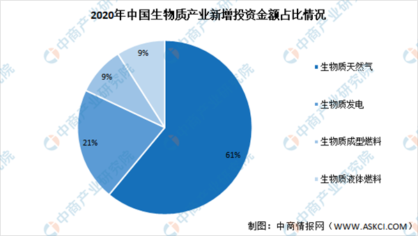 數(shù)據(jù)顯示,2020年我國生物質(zhì)產(chǎn)業(yè)新增投資金額中,生物質(zhì)天然氣占比最大達61%,生物質(zhì)發(fā)電占比達21%,生物質(zhì)成型燃料及生物質(zhì)液體燃料占比均達9%。
