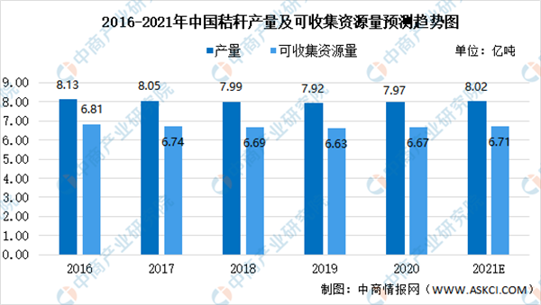 秸稈是一種很好的清潔可再生能源,是最具開發(fā)利用潛力的新能源之一,分為秸稈氣化發(fā)電和秸稈燃燒發(fā)電。數(shù)據(jù)顯示,2020年我國秸稈產(chǎn)量達7.97億噸,可收集的秸稈資源量達6.67億噸。據(jù)預測,2021年我國秸稈產(chǎn)量可達8.02億噸,可收集的秸稈資源量達6.71億噸。