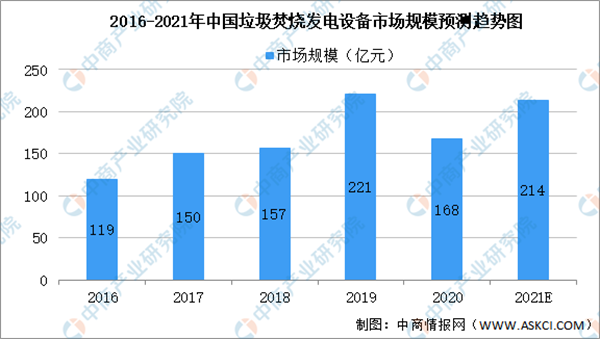 焚燒爐作為垃圾焚燒處理系統(tǒng)最核心的設備,其設計需充分考慮垃圾停留時間、燃燒溫度、煙氣在爐內(nèi)的停留時間及紊流等因素,從而達到完全燃燒、控制惡臭及二噁英類物質(zhì)產(chǎn)生的目的。目前國內(nèi)外應用較多、技術(shù)比較成熟的生活垃圾焚燒爐主要包括爐排爐型焚燒爐、流化床焚燒爐等。2020年,垃圾焚燒發(fā)電設備市場規(guī)模約為168億元,預計2021年我國垃圾焚燒發(fā)電設備市場規(guī)??蛇_214億元。