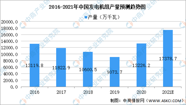 一般我們常見的發(fā)電機組通常由汽輪機、水輪機或內(nèi)燃機(汽油機、柴油機等發(fā)動機)驅(qū)動,可再生新能源包括核能、風能、太陽能、生物質(zhì)能、海洋能等。數(shù)據(jù)顯示,我國發(fā)電機組產(chǎn)量呈波動趨勢,2020年我國發(fā)電機組產(chǎn)量達13226.2萬千瓦,預計2021年我國發(fā)電機組產(chǎn)量可達17378.7萬千瓦。