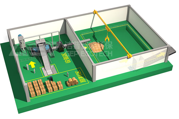 設(shè)備選型為雙軸剪切式破碎機(jī),處理產(chǎn)量為每小時50-60噸的秸稈捆料,處理后的尺寸滿足焚燒要求。雙軸剪切式破碎機(jī)是核心設(shè)備,低轉(zhuǎn)速大扭矩工作原理在設(shè)備工作過程中將設(shè)備噪音降到比較低,兩個轉(zhuǎn)子刀具對向剪切將大件垃圾物料剪切成較小塊狀,便于下一步精細(xì)化處理。設(shè)備刀具材料選用歐洲進(jìn)口材質(zhì),由潔普自主加工生產(chǎn),保證設(shè)備刀具使用壽命更長,日常經(jīng)營成本減少了刀具維護(hù)這塊。主機(jī)設(shè)備增加檢修維護(hù)平臺,便于日常設(shè)備的檢修維護(hù)提供空間操作。